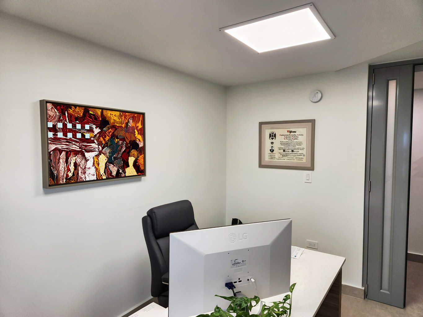 - Mediana enmarcada = $350.00 • Estrechada en bastidor, enmarcada en moldura flotante. Para entrega en persona en Puerto Rico.